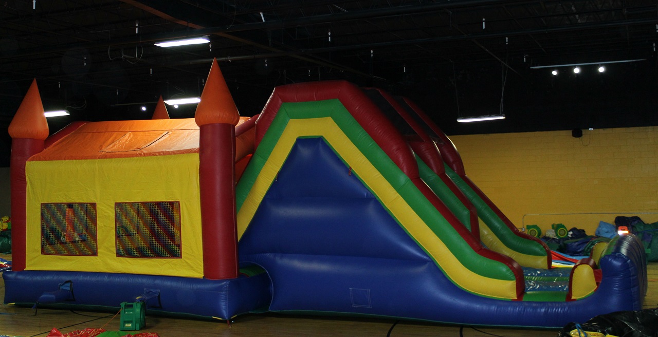 Description: This Jumbo Jump & Slide Combo bounce house has a huge jumping area and two fast slides. As you climb in from the entrance this combo will have a large bouncing area and two long slides. Once kids are ready to exit, they just climb to the top and on to the slides. For stability there are sewn in handles to keep you steady. Once you get to the top slide down to exit and do it all over again!
